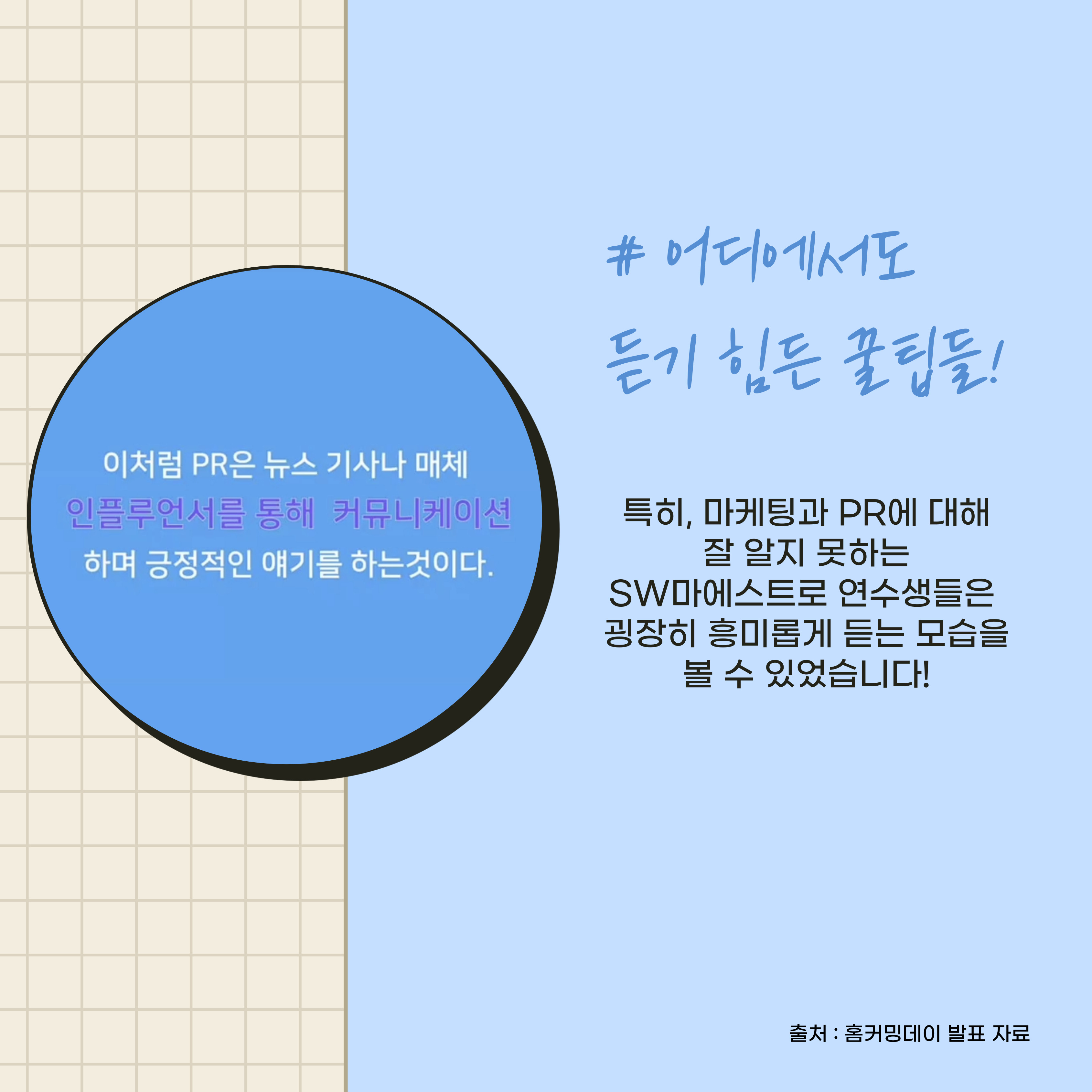 특히, 마케팅과 PR에 대해 잘 알지 못하는 SW 마에스트로 연수생들은 굉장히 흥미롭게 듣는 모습을 볼 수 있었습니다!