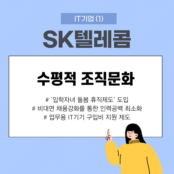 첫번째 #SK텔레콤 의 경우에는 “수평적 조직문화”가 대표적인 기업 문화입니다.