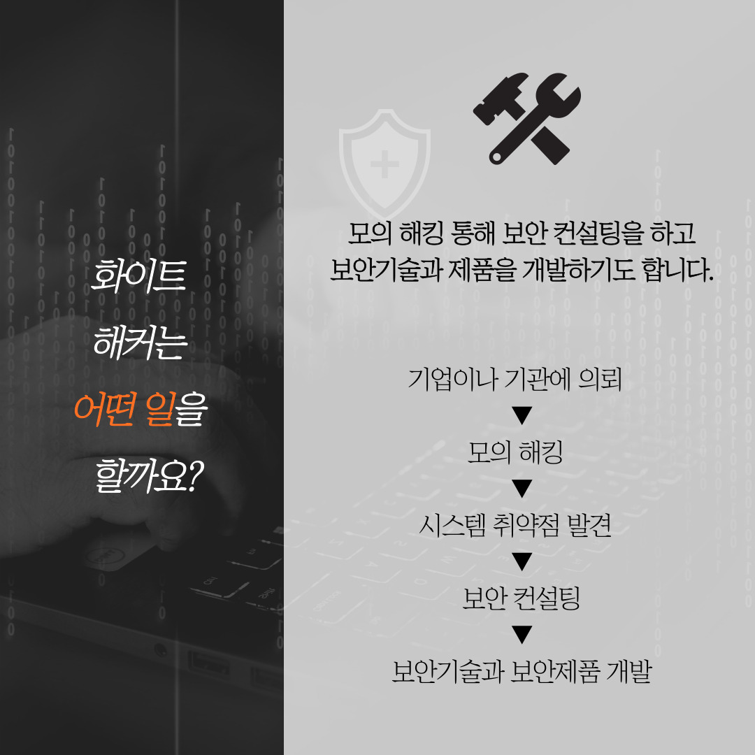 화이트 해커는 기업이나 기관의 의뢰로 모의해킹을 통해 시스템 취약점을 발견하고 보안 컨설팅을 진행한 뒤 보안기술과 보안제품을 개발합니다.