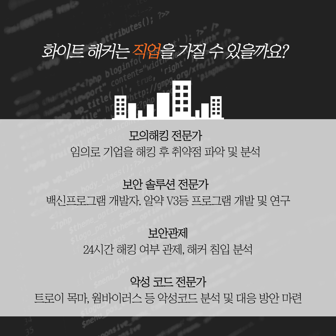 그럼 화이트 해커가 가질 수 있는 직업은 어떤 것이 있을까요?