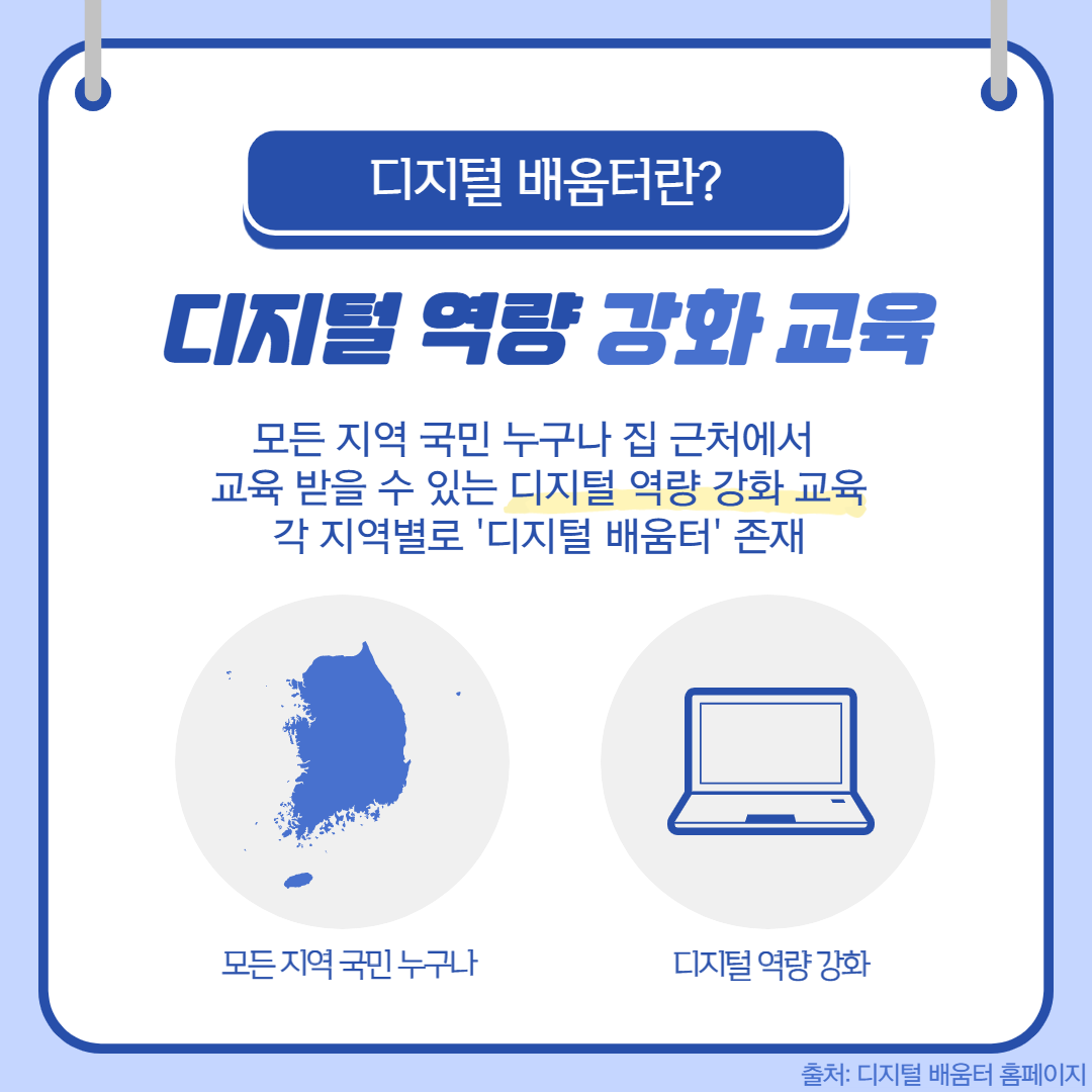 디지털 역량 강화 교육을 위해 각 지역별마다 ‘디지털 배움터’가 존재하는데요, 카드뉴스를 통해 함께 살펴보실까요?