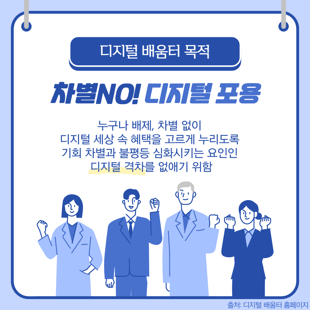 다시 말해, 사회·경제적 기회 차별과 불평등을 심화시키는 요인이 되는 디지털 격차를 없애려는 목적이에요.
