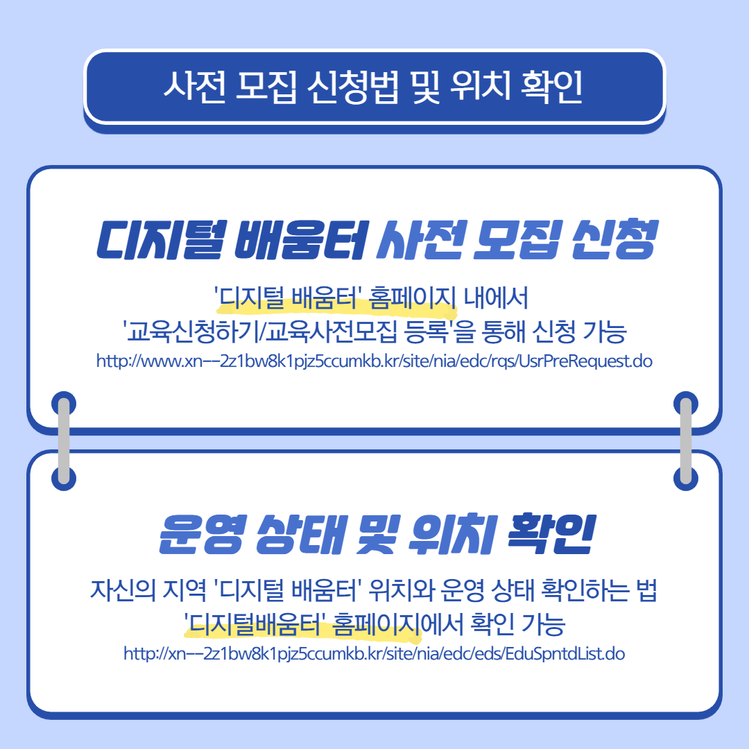 아래 링크를 통해 각 지역과 교육과정 등을 검색한다면 ‘디지털배움터’ 운영 상태와 위치 모두 확인 가능하답니다. 참고하세요!