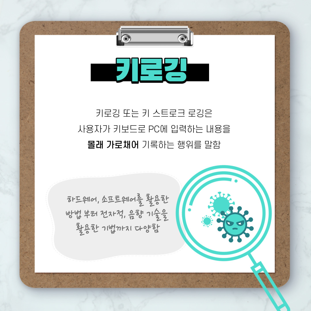 키로깅 또는 키 스트로크 로깅은 사용자가 키보드로 PC에 입력하는 내용을 몰래 가로채어 기록하는 행위를 말하며,