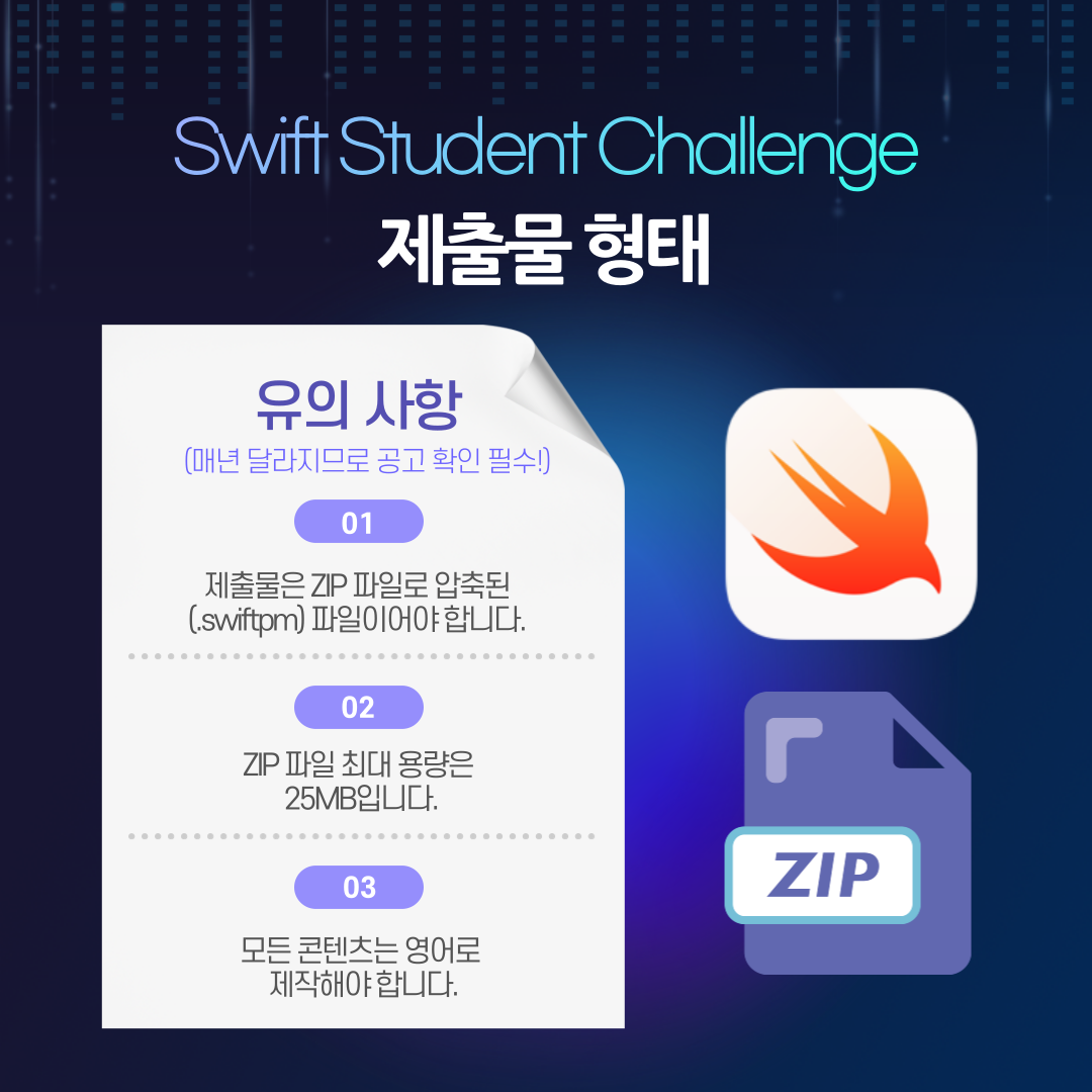 출품할 때 제출물 형태는 앞서 말씀드렸듯이 Swift Playground 앱으로 제작한 파일(.swiftpm 형태)이어야 합니다.