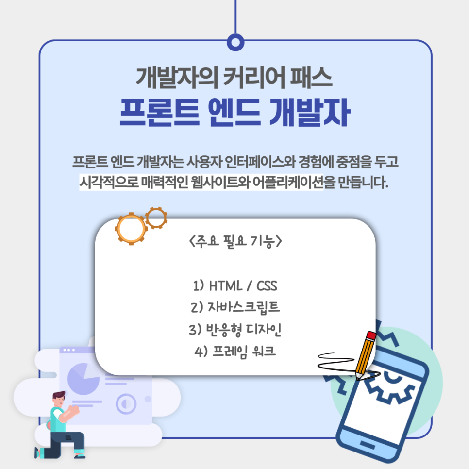 프론트 엔드 개발자는 사용자 인터페이스와 경험에 중점을 두고 시각적으로 매력적인 웹사이트와 어플리케이션을 만듭니다.