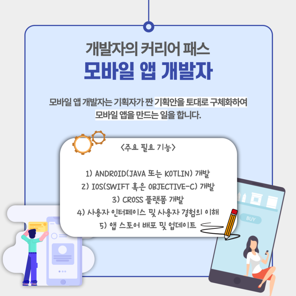 모바일 앱 개발자는 기획자가 짠 기획안을 토대로 구체화 하여 모바일 앱을 만드는 일을 합니다.