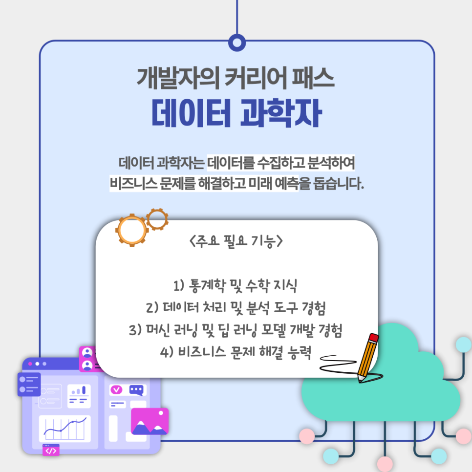 마지막으로 데이터 과학자는 데이터를 수집하고 분석하여 비즈니스 문제를 해결하고 미래 예측을 돕습니다.