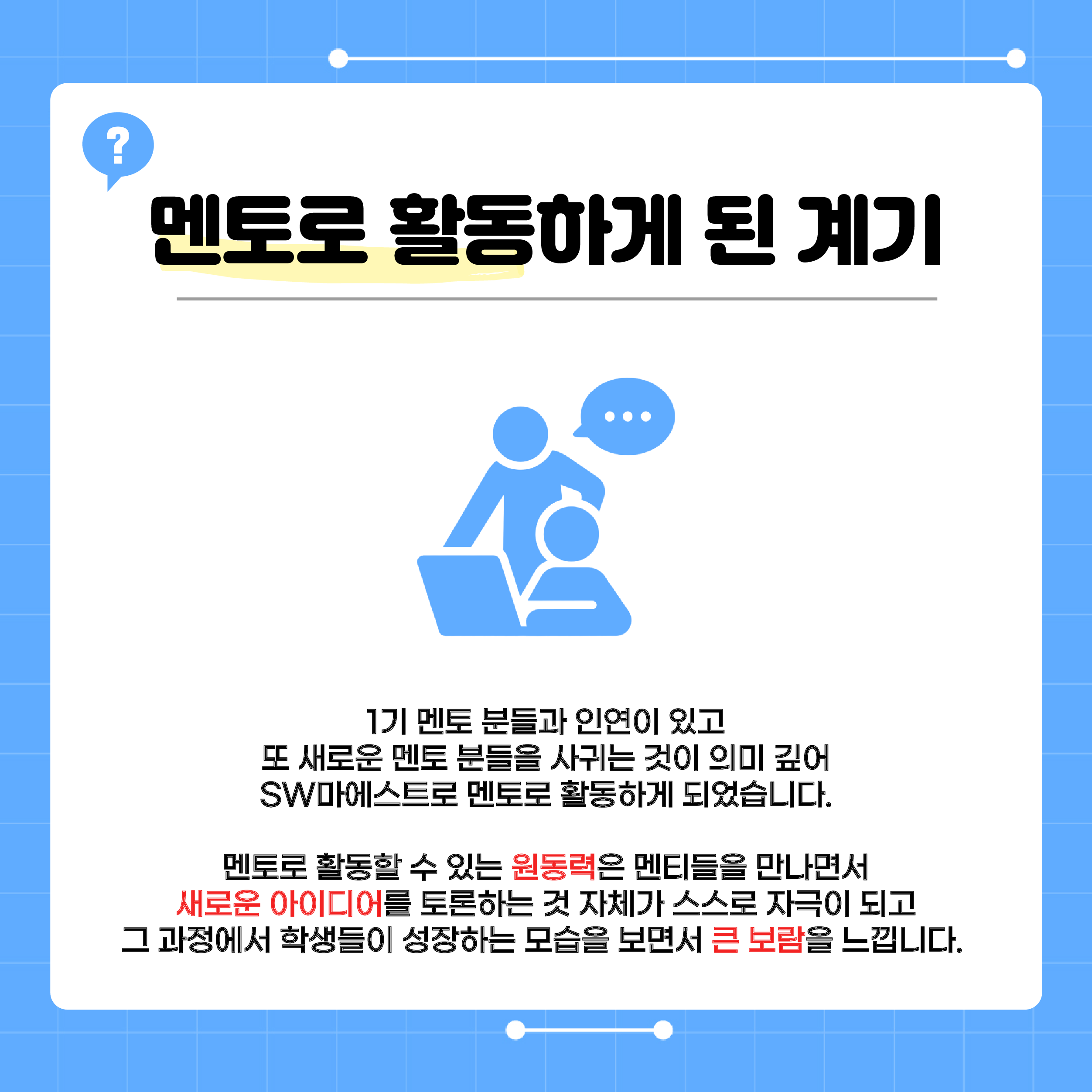 SW마에스트로 멘토로 활동하게 되었습니다.멘토로 활동할 수 있는 원동력은