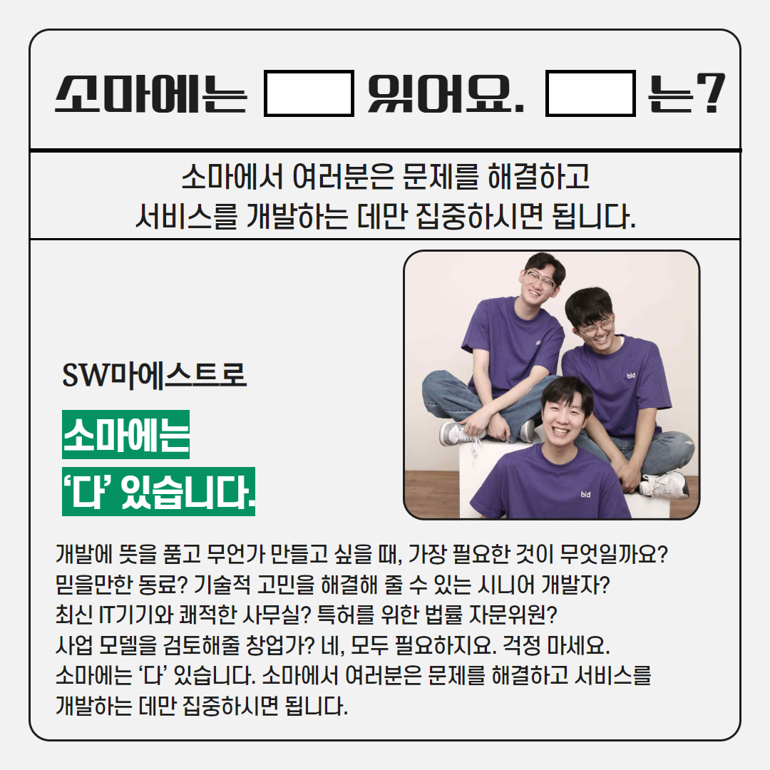 소마에는 ‘다’ 있습니다. 소마에서 여러분은 문제를 해결하고 서비스를