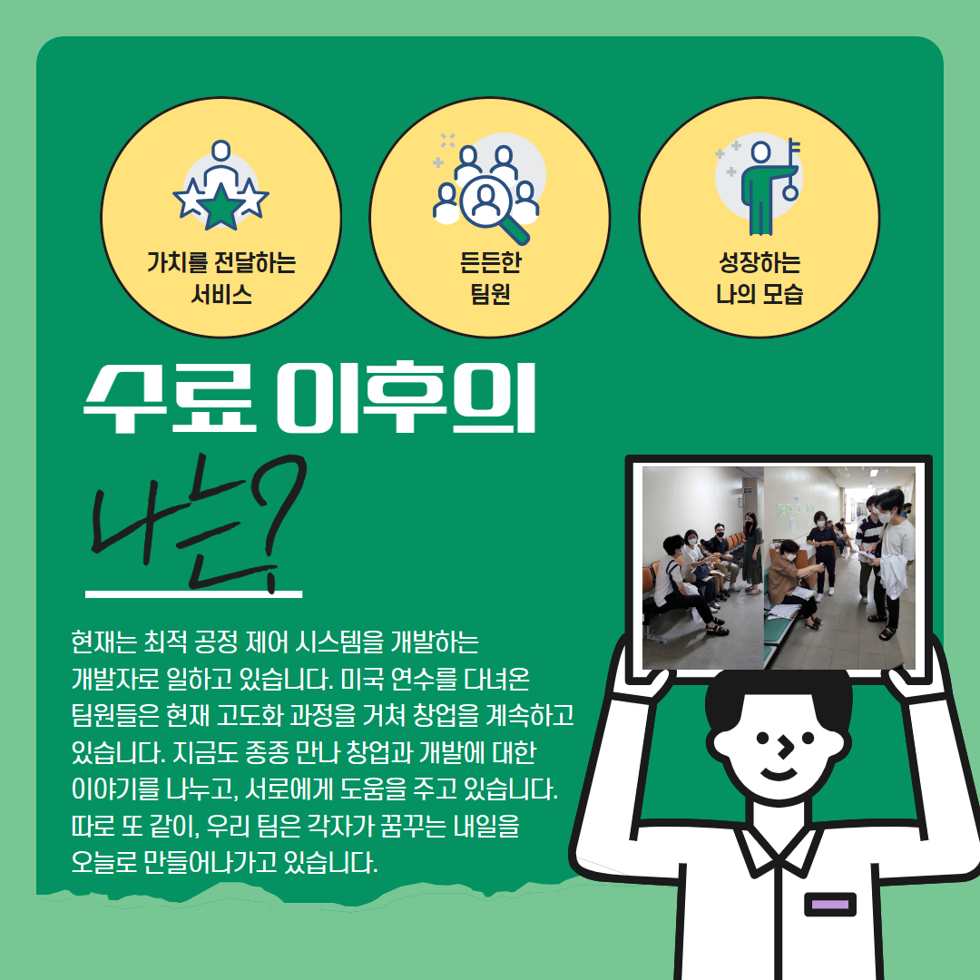 미국 연수를 다녀온 팀원들은 현재 고도화 과정을 거쳐 창업을 계속하고 있습니다.