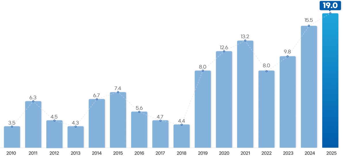 AI·SW마에스트로의 경쟁률은 15년간 평균 8.3:1의 추이를 보이고 있습니다. 2024년 15.5:1의 경쟁률에 이어 2025년 19:1로 역대 최고의 경쟁률을 기록하였습니다.