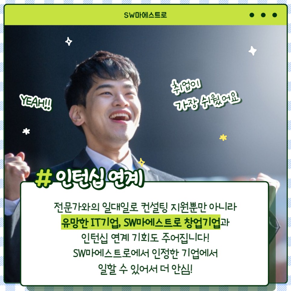 전문가의 1:1 컨설팅 지원과 유명한 IT기업, SW마에스트로 창업기업에 인턴십 연계 기회도 주어집니다!