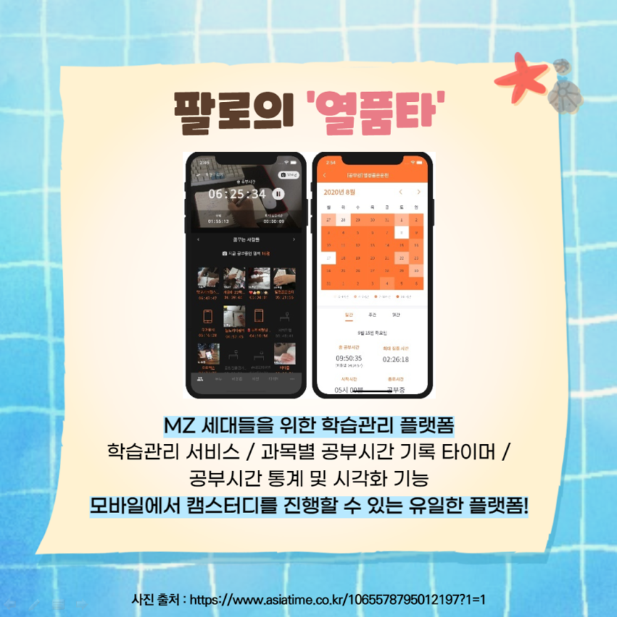 팔로에서 제공하는 플랫폼은 MZ 세대들을 위한 학습관리 서비스로 ‘열품타’입니다.
