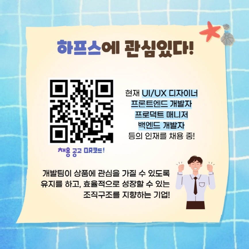 현재 하프스에서는 UI/UX 디자이너, 프론트앤드 개발자, 프로덕트 매니저, 백엔드 개발자 등의 인재를 채용 중에 있습니다.
