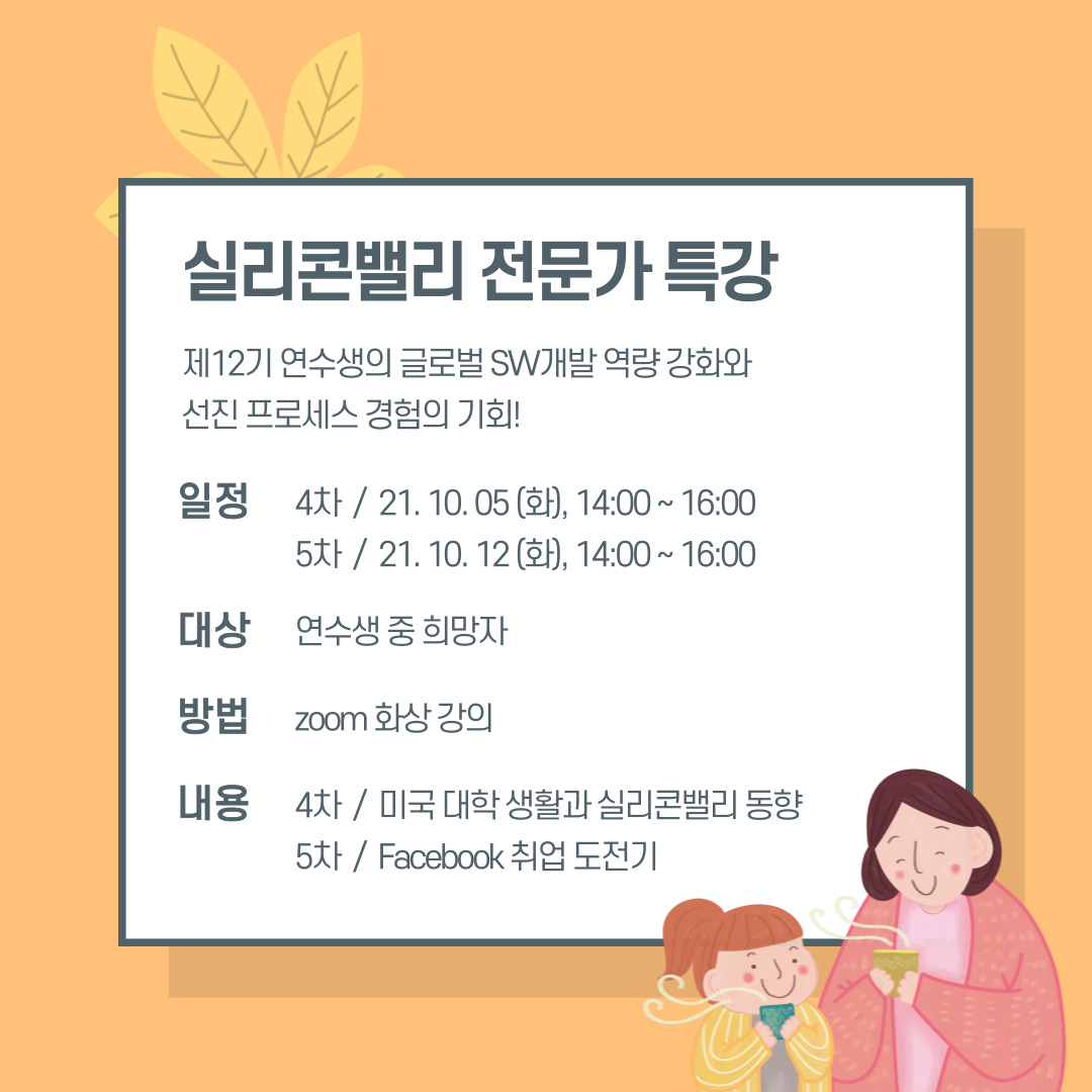 10월 5일(화) 14시~16시에 진행되는 4차에서는 미국대학생활과 실리콘밸리 동향에 대해,