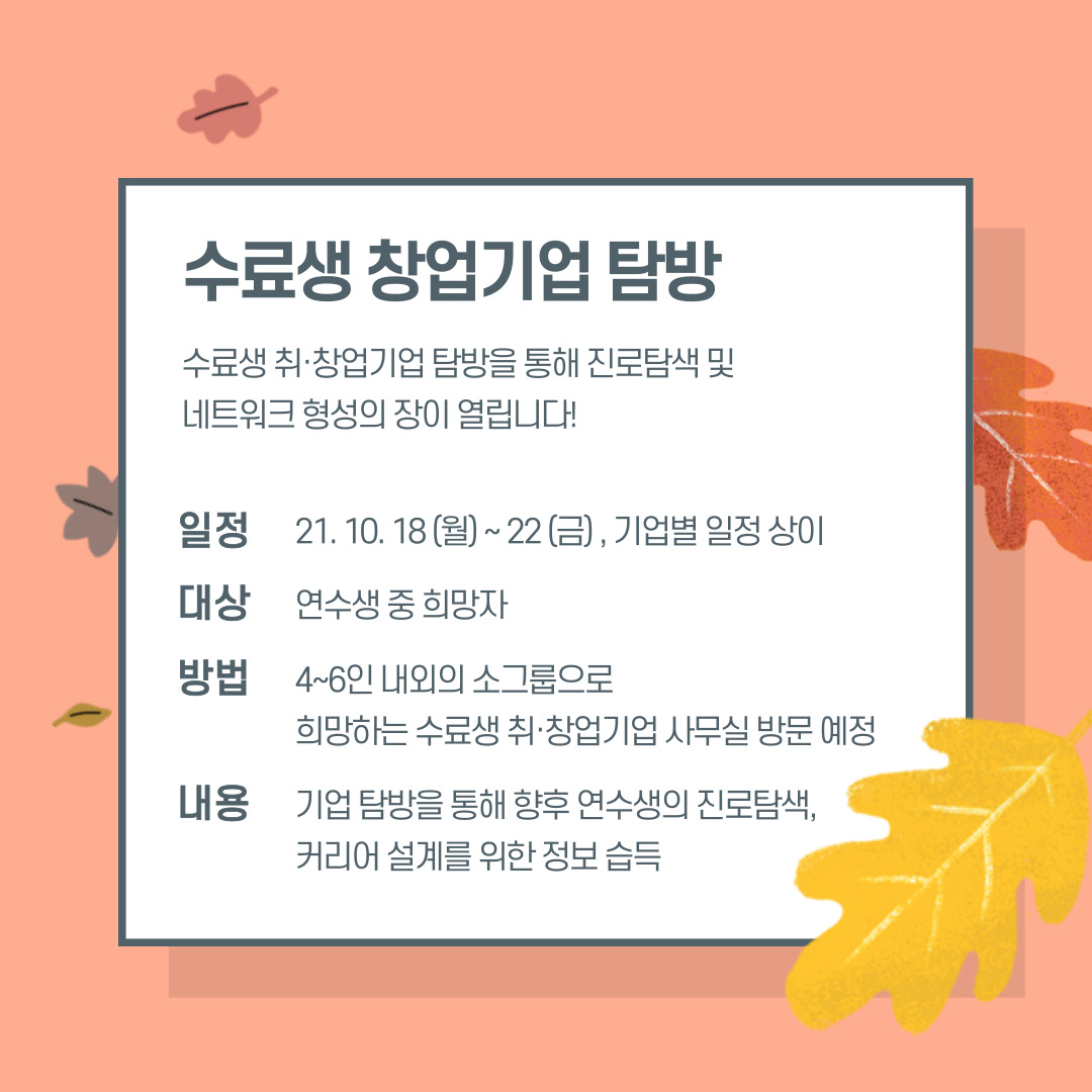 연수생 중 희망자를 대상으로 4~6인 내외의 소그룹으로 희망하는 수료생 취창업기업 사무실을 방문할 예정입니다.