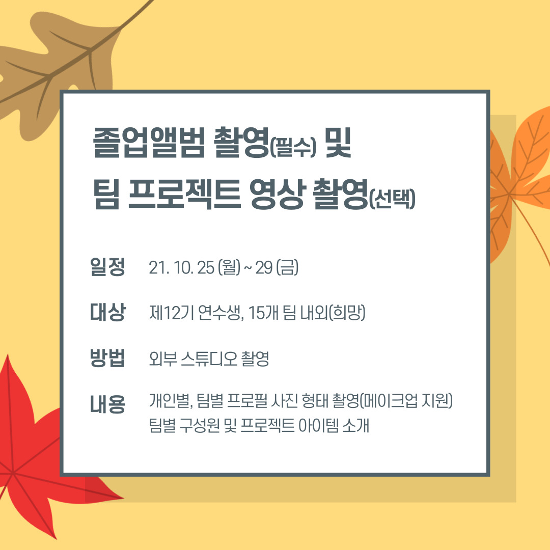 두근두근 다섯 번째 행사는 ‘졸업앨범 촬영(필수)및 팀 프로젝트 영상 촬영(선택)’ 입니다!