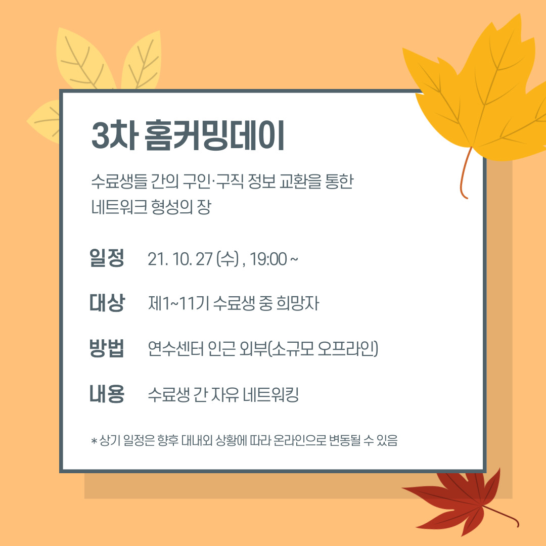 제1기~11기 수료생 중 희망자를 대상으로 10월 27일(수) 19시부터