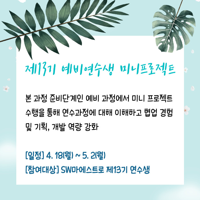 4. 18(월)부터는 제13기 예비연수생 미니프로젝트가 시작됩니다.