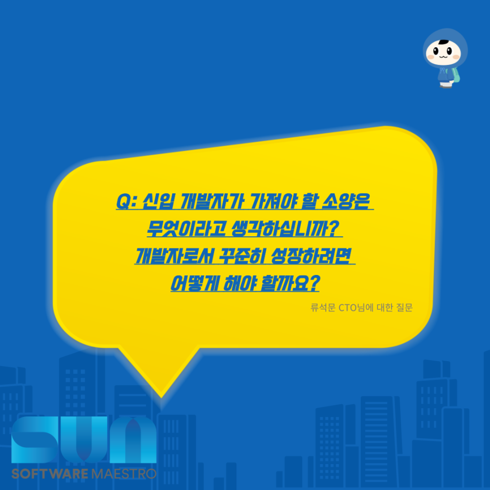 Q: 신입 개발자가 가져야 할 소양은 무엇이라고 생각하십니까? 개발자로서 꾸준히 성장하려면 어떻게 해야 할까요?