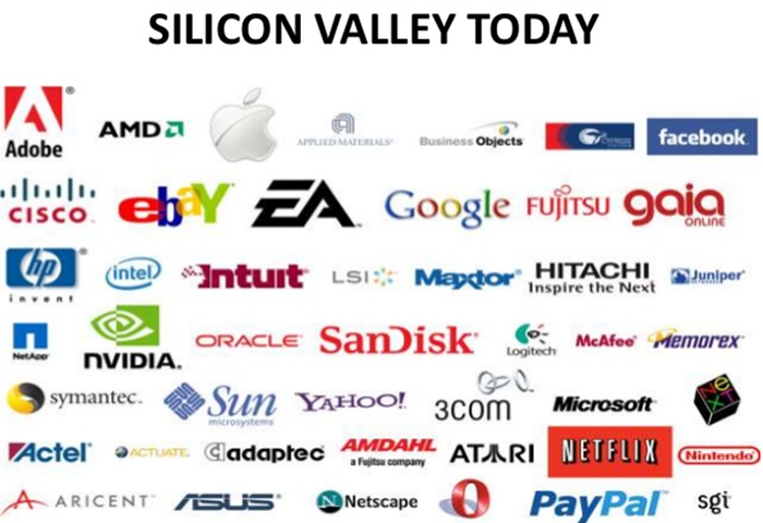 실리콘 밸리는 원래 산타클라라 밸리 + 실리콘 반도체 산업을 뜻합니다. 실리콘 반도체를 통해 업계의 성장이 촉진되었고, 산타클라라 밸리 지역에 위치해 있으므로 이 두 단어의 결합이 실리콘 밸리를 이룹니다.