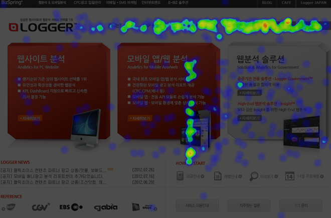 다음으로 비교 시각화의 대표적인 방법이라고 할 수 있는 히트맵웹사이트 방문자 분석을 위한 웹로그 분석에서 많이 활용됩니다. 방문자의 마우스 클릭을 열 분포 형태 이미지로 변환하여 사이트 이미지 위해 겹쳐 보이게 하며, 클릭이 많은 영역은 빨간색으로 적은 곳은 파란색으로 표현되기 때문에, 광고 배너를 어디에 배치해야 클릭률이 높아질지 예측하는 등에 유용하게 사용할 수 있죠.