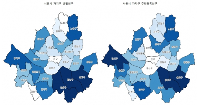 마지막으로 공간 시각화는 지도 매핑을 통해 나타낼 수 있는데요. 예시는 KT와 서울시가 공동으로 개발한 ‘서울 생활인구’의 자치구별 인구 밀도 이미지입니다. 색깔이 진한 부분이 인구가 많은 지역으로 주민등록인구와 달리 실제 생활인구는 다른 패턴을 보인다는 해석이 가능하죠.