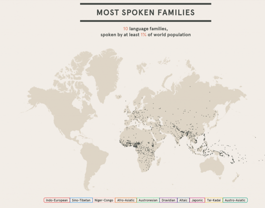 이 데이터 시각화는 세계의 현재 언어 상황에 대한 분석을 보여줍니다. 총 2,678 개의 언어가 어디서 기원하는지, 어디서 쓰이는지 그리고 사용하는 인구 수와 함께 나와 있습니다. 어족, 외래어, 차용어, 다른 언어 간에 교환된 어휘 등 언어 간의 관계까지도 보여줍니다.