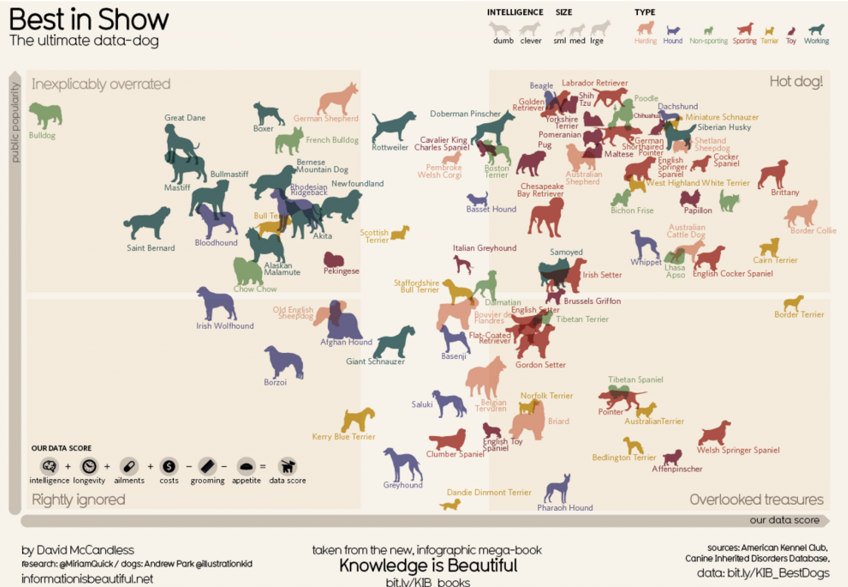 American Kennel Club에 따르면 개 인기에 대한 데이터 시각화를 만들기 위해 제조사들은 지성, 수명, 유전자 질환 및 기타 요소들에 대한 데이터를 검토하여 데이터 점수를 만든 다음 다양한 품종의 대중적 인기에 대비하여 그 데이터를 표시했습니다.