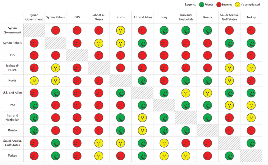 해당 데이터 시각화는 시리아에서 싸우는 국가와 그룹 간의 복잡한 관계를 간략하게 보여줍니다. 녹색 얼굴은 친구를, 빨간색은 적을, 노란색은 회색 영역을 나타냅니다.