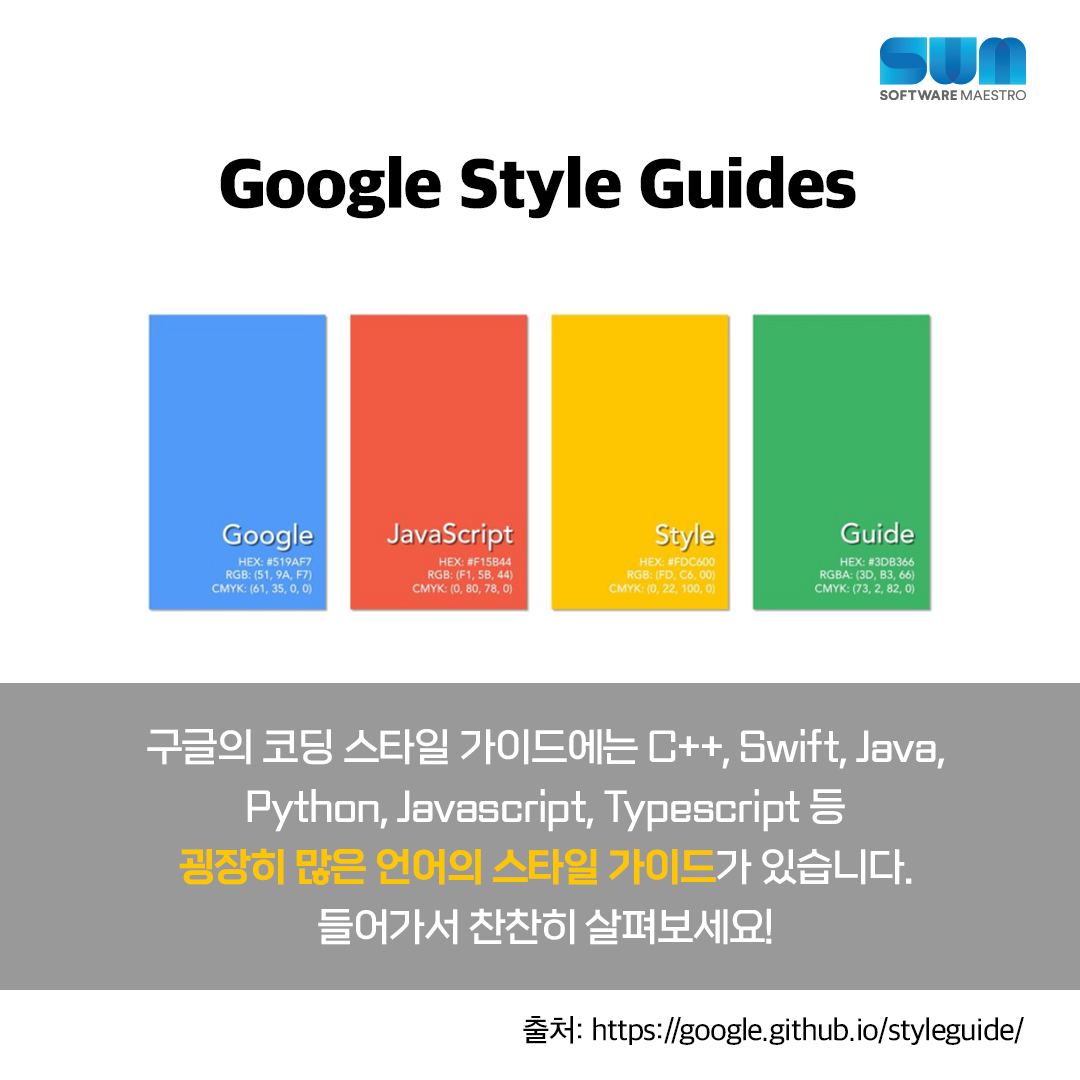 구글의 코딩 스타일 가이드에는 C++, Swift, Java, Python, Javascript, Typescript 등 굉장히 많은 언어의 스타일 가이드가 있습니다.
