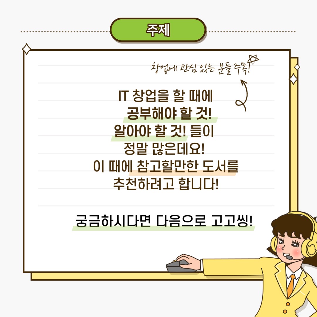 오늘은 IT 창업 도서 추천 목록을 소개해 드리려고 합니다 ^^