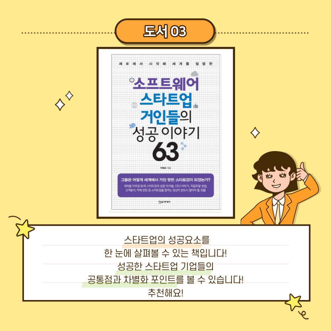 '소프트웨어 거인들의 성공 이야기 63'은 스타트업의 성공요소를 한 눈에 살펴볼 수 있는 책입니다!