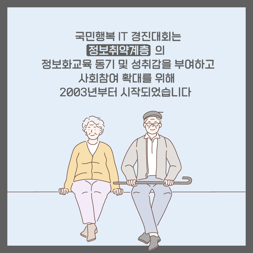 국민행복 IT 경진대회는 정보취약계층의 정보화교육 동기 및 성취감을 부여하고 사회참여 확대를 위해 2003년부터 시작되었습니다.