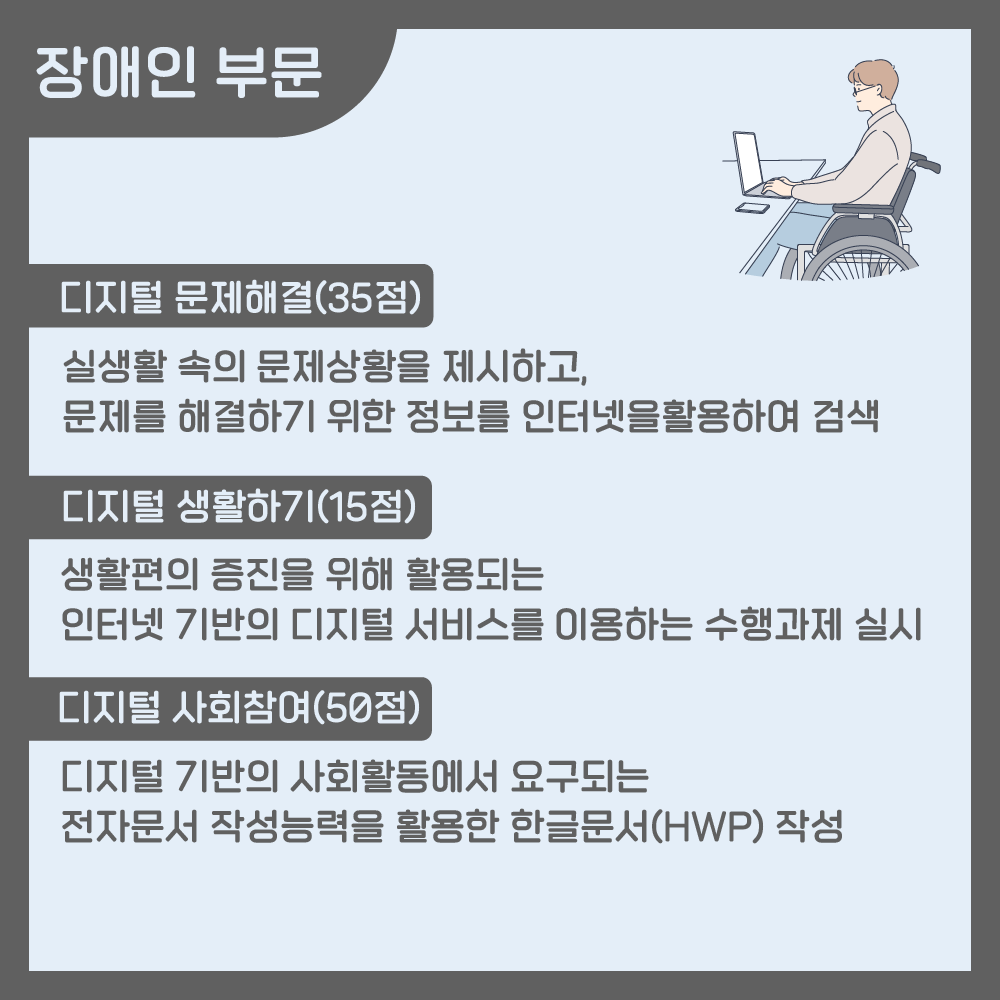 대회내용 유형은 장애인 부문과 동일합니다. 실생활 속의 문제상황을 제시하고 문제 해결을 위한 정보를 인터넷을 활용하여 검색하는