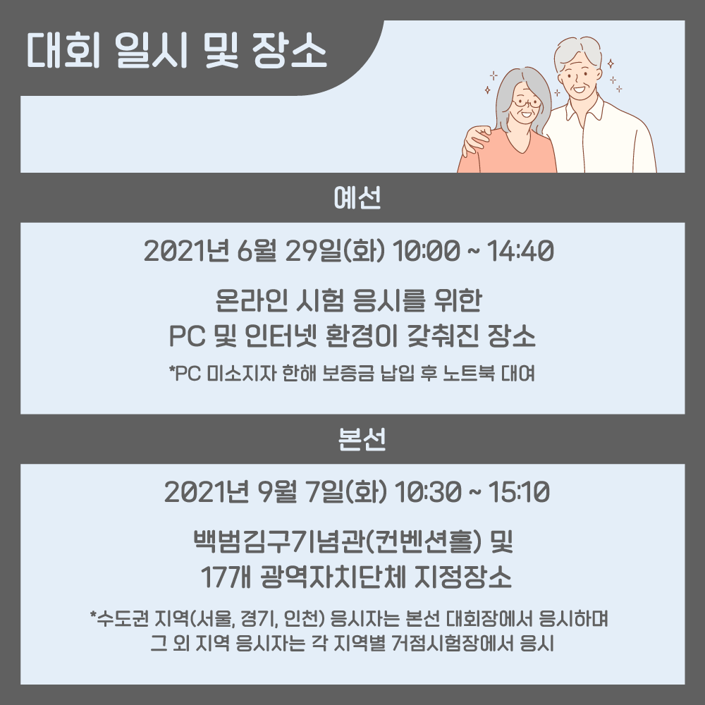 또한 본선은 2021년 9월 7일 (화) 10:30~15:10에 백범김구기념관(컨벤션홀) 및 17개 광역자치단체 지정장소에서 진행됩니다.