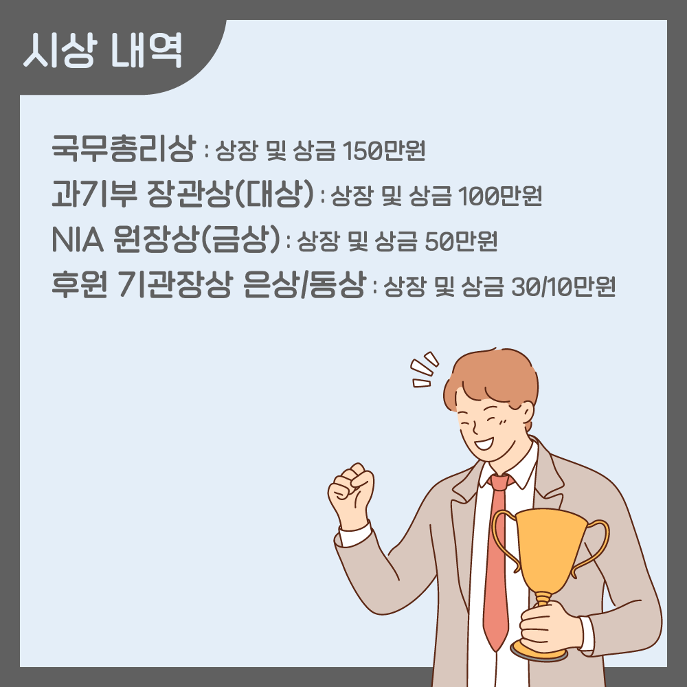 상장 및 상금 50만원의 NIA 원장상(금상), 그리고 상장 및 상금 30/10만원의 후원 기관장 은상과 동상이 있습니다.
