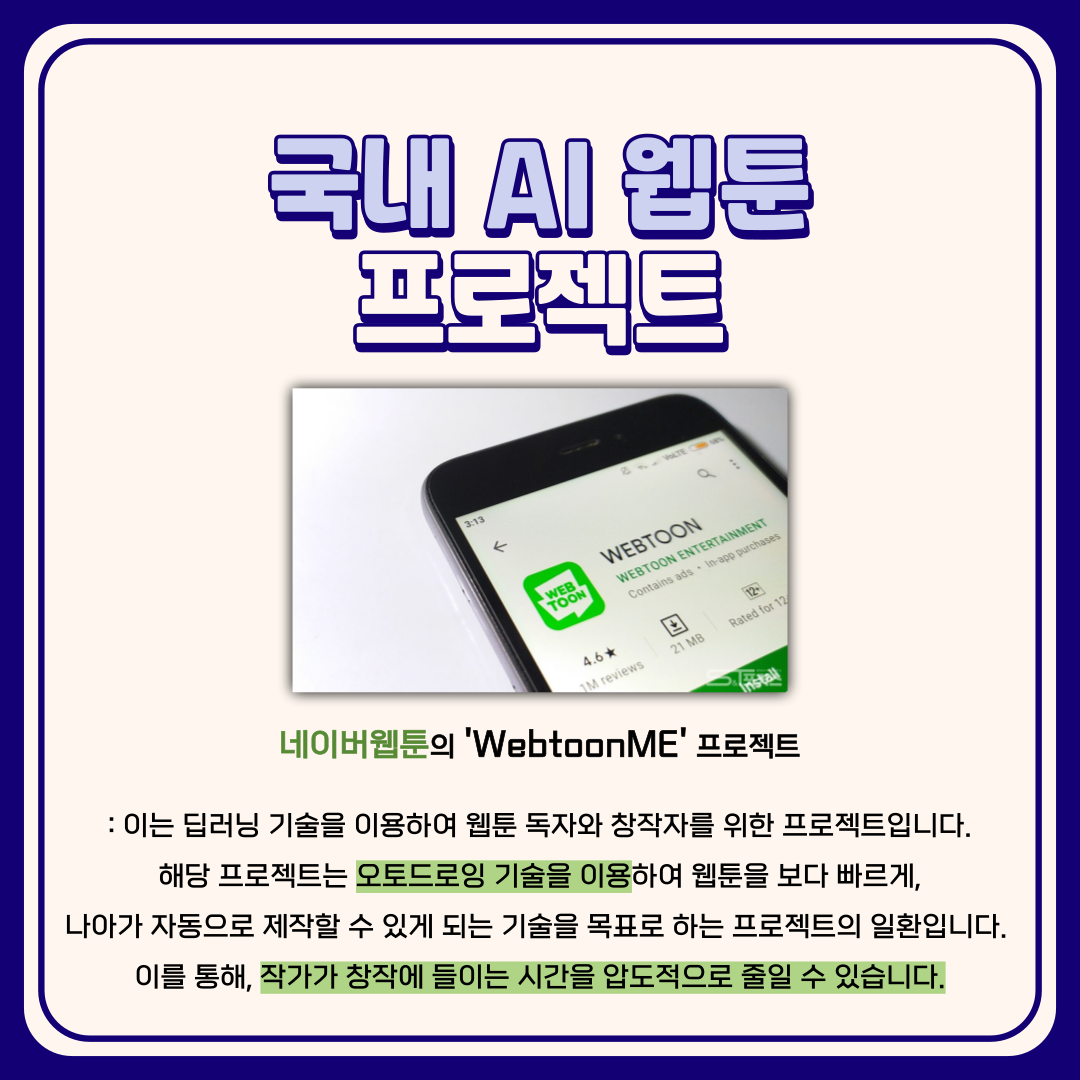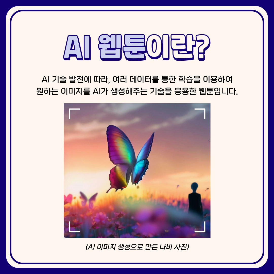 AI 웹툰은 여러 데이터를 통한 학습으로 원하는 이미지를 AI가 생성해주는 기술을 응용한 웹툰입니다.