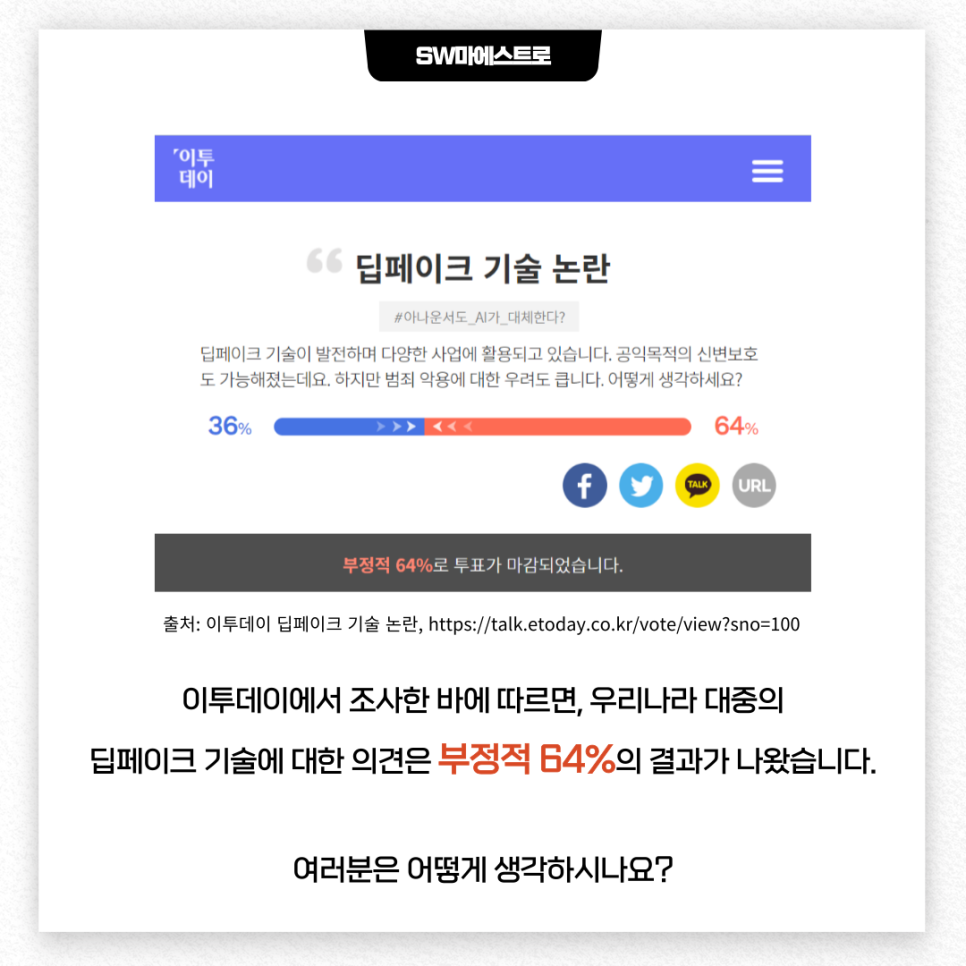 이투데이에서 조사한 바에 따르면 딥페이크에 대해 대부분 부정적인 의견을 갖고 있다고 합니다.