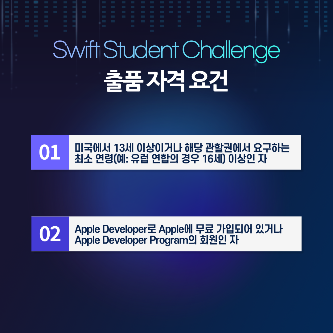 몇 가지 자격요건을 충족하는 사람이라면 누구나 참여할 수 있는 iOS 앱 개발 공모전이고, Swift Playground 앱을 이용하여 제작해서 출품해야 합니다.