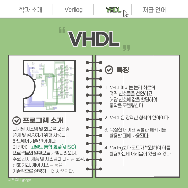 베릴로그와 함께 전자 칩 용 프로그램을 작성하는 데 사용되는 대표적인 HDL로 뽑히고 있는데요,