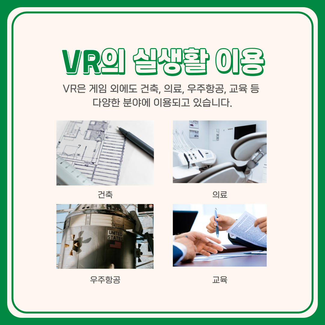 VR은 이렇게 다양한 분야에서 활용되고 있습니다.
