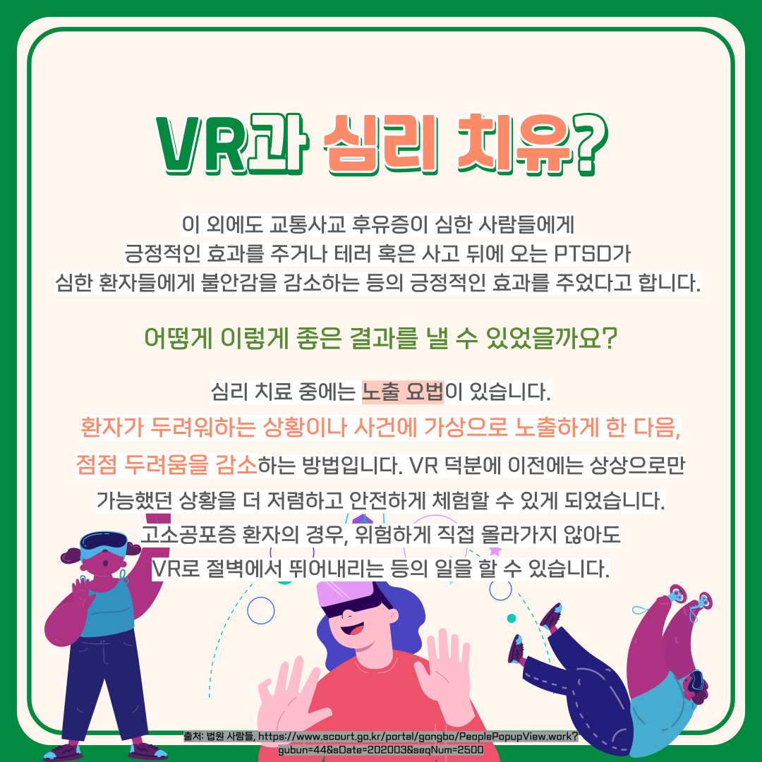 그런데 이 VR이 사람의 심리 치유 효과에도 긍정적인 영향을 준다고 해요.