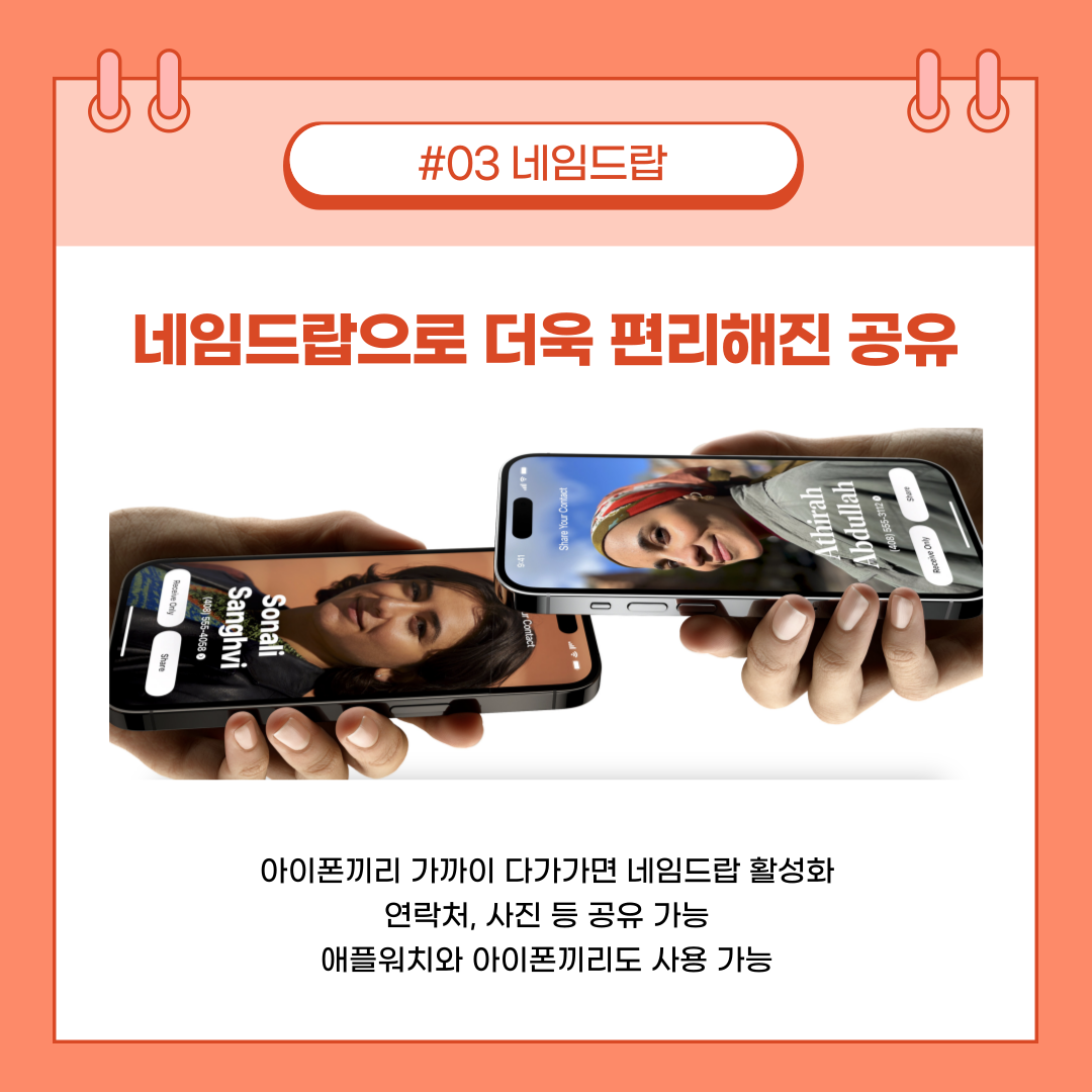 iOS17부터는 에어드랍을 할 때에도 네임드랍을 할 때처럼 아이폰끼리 가까이 다가가면 사진, 문서 등의 파일 공유가 가능하다고 합니다.
