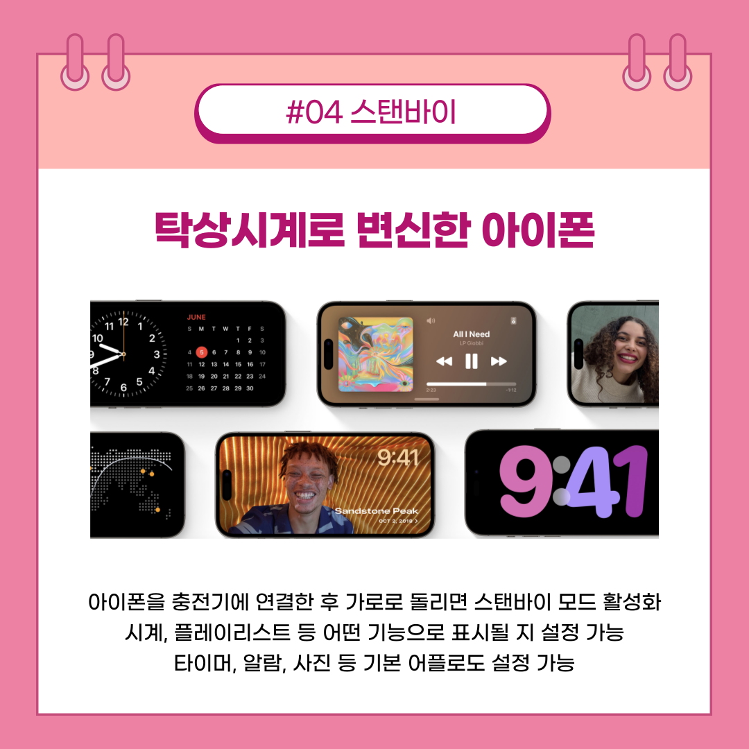 이 기능을 사용하면 아이폰을 전자 탁상시계처럼 사용할 수 있고, 시간을 확인하는 용도뿐만 아니라, 타이머, 알람, 사진 등의 기본 어플들을 추가하여 사용할 수도 있다고 합니다.