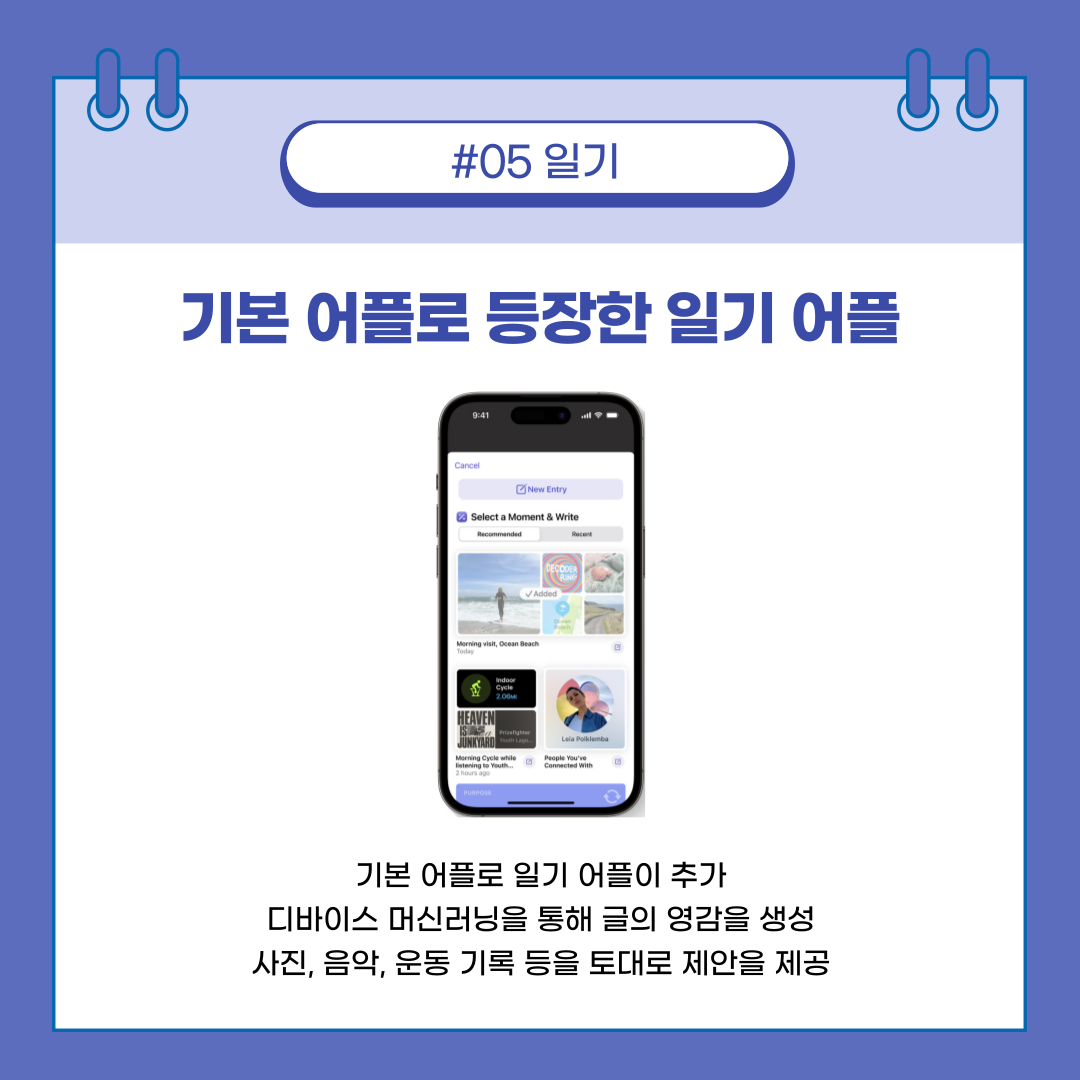 일기 어플은 단순히 일기만 쓰는 것이 아니라, 머신러닝을 통해 그날 그날마다 사진, 음악, 운동 기록 등을 분석하여 글의 영감을 제공해 준다고 합니다.