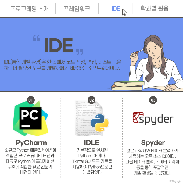 위에 나와 있는 소프트웨어는 대표적인 파이썬 IDE입니다.