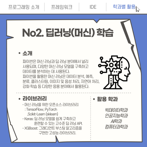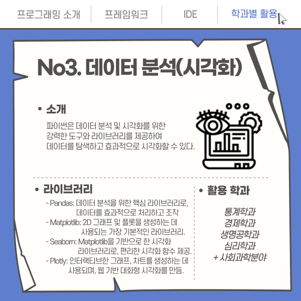 지금부터는 학과별로 파이썬을 어떻게 활용하고 있는지 살펴보도록 하겠습니다!