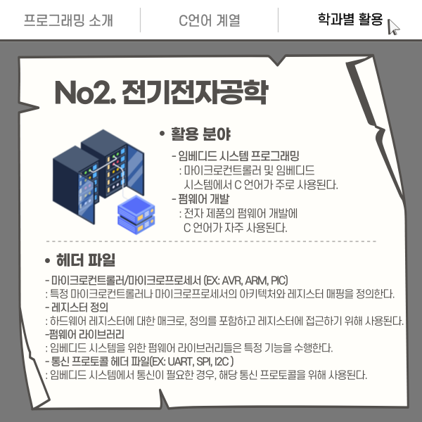 두 번째 '전기전자공학과'에서 C언어는 마이크로컨트롤러 및 임베디드 시스템 프로그래밍에 주로 활용되며,